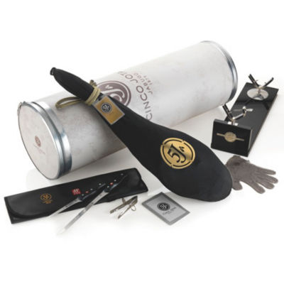 - A phenomenal gift for the aficionado - Premium 5J bone-in Bellota grade ham (about 13 lbs) - Free-range, acorn-fed, pure Iberico - Includes 5J jamon carving stand - Carving set: 2 knives, pincers plus chainmail glove Become a ham master or give the ultimate gift to the Maestro Cortador in your life! This beautifully packaged gift container holds a whole bone-in, acorn fed Jamon Iberico de Bellota ham, a striking black 5J ham holder, two premium ham carving knives, stainless steel pincers for serving jamon and a chainmail glove to protect the non-slicing hand.5J Jamon Iberico de Bellota is the most luxurious cured ham in the world. Served at room temperature, bellota ham will literally begin to melt, bathing it in incredible, complex flavor. Like Beluga caviar or Kobe beef, this is the finest of its kind. Just a small bite will open a world of flavor beyond any cured meat anywhere. Discover this treasure of Spanish cuisine, or share this beautifully packaged gift pack with the gourmet in your life.5J, or Cinco Jotas, is the elite brand of Iberico ham. In fact, even the home town where they are based has become legendary. The word Jabugo is now synonymous with top quality Iberico meats, and is the town made famous by 5J.5J uses only 100% genetically pure Iberico pigs that live their entire lives wandering the countryside of Spain. Other ham brands will cross breed Iberico pigs with other breeds to increase the litter size and raw meat production. 5J controls its own herds to ensure that each ham is made from pure Iberico stock.The special breed, life of exercise, rich acorn diet and careful curing (over two years) all culminate in a Jamon Iberico de Bellota that is beyond exceptional!